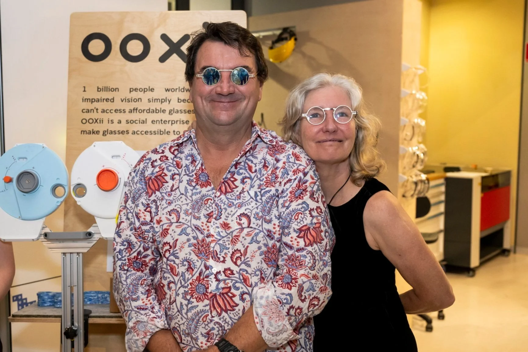 Sarah and Simon Thomsen (Startup Daily) wearing ooxi glasses, in the background a display of her vision testing device.